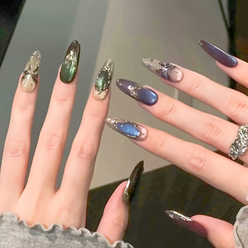 A Set of 10 High-End, Transparent Black And Silvery Cat-Eye Long Nail Tips Made with Pure Handcraft -