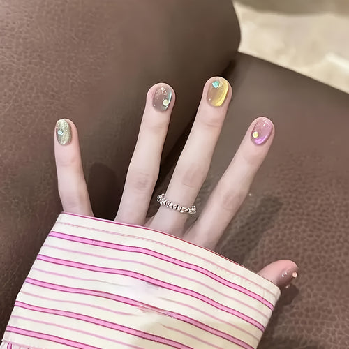 Handmade Press-On Nails - Butterfly Dance Design, Short Ballet Shape with Glossy Pink & White Glitter Accents -
